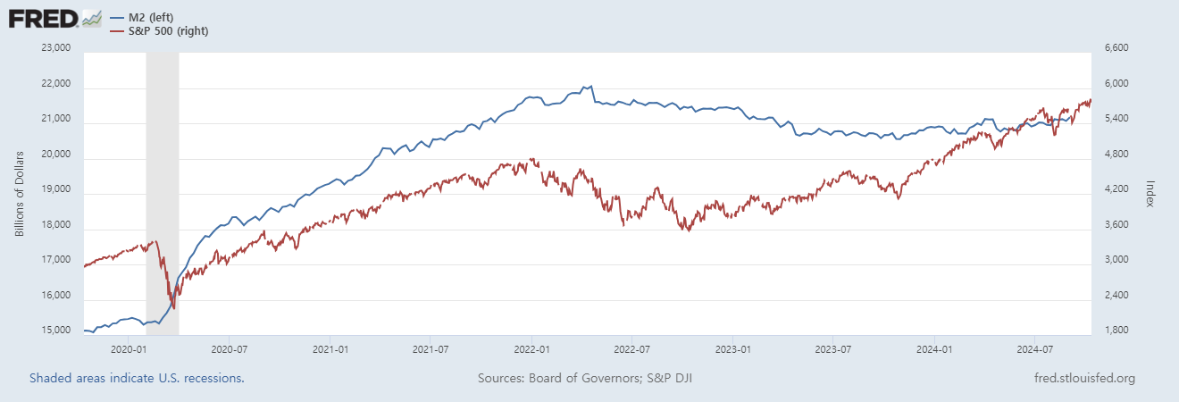 위 그래프는 m2통화량과 s&p500의 그래프를 나타내는데 방향성이 비슷하다고 할 수 있다.