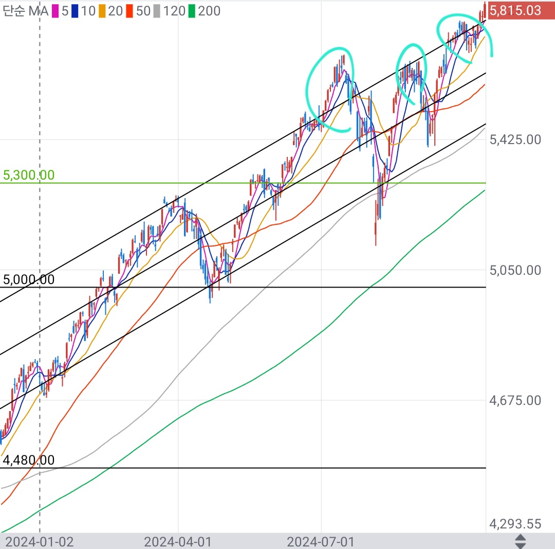 S&P500은 7월 1일, 8월26일, 9월 26일 채널 상단까지 올라가고 있다.