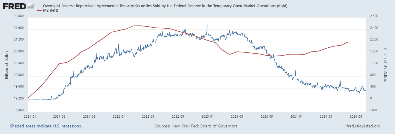 역레포 계좌에 한때 2조달러가 넘계 예치되어 있었으나, '24년 9월에는 4000억달러 밑까지 떨어졌다.
