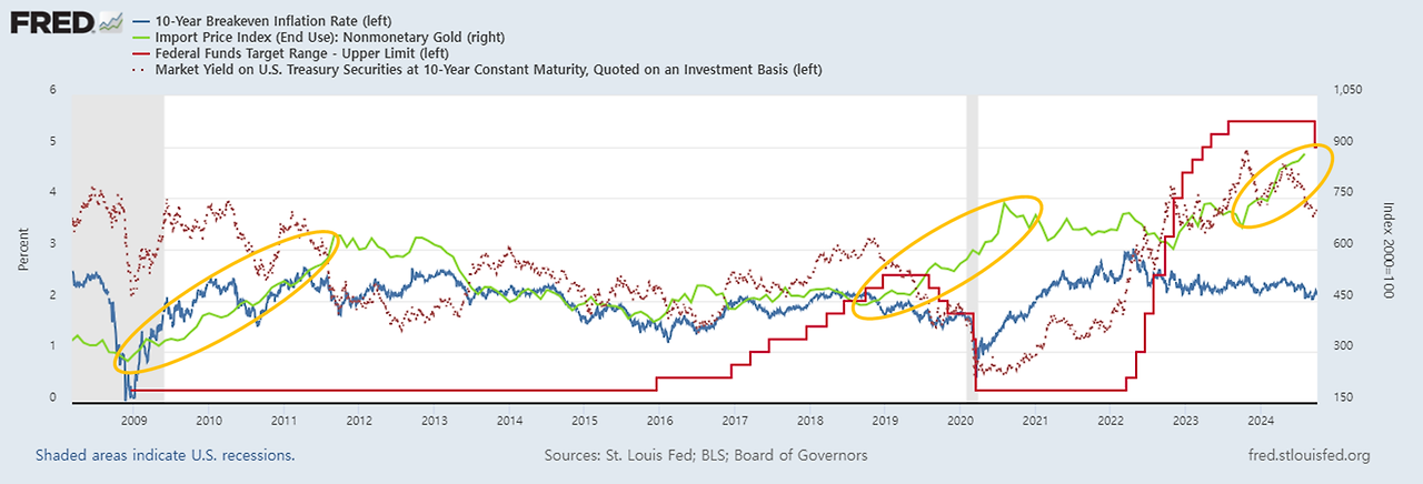 그리고 금리 인하를 시작하여 양적완화에 따라 인플레기대치가 다시 어느정도 높아기지까지 금은 상승합니다.