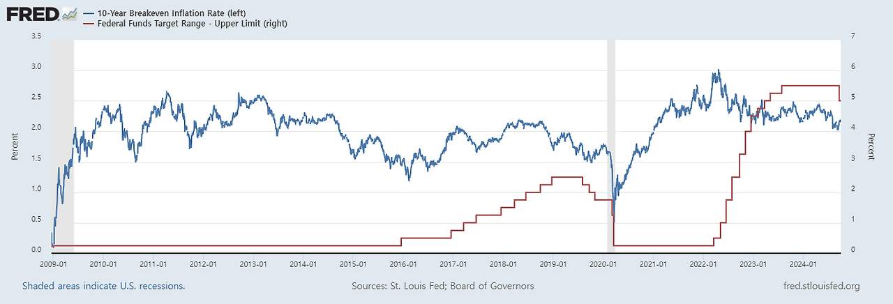 따라서, Breakeven Inflation Rate는 시장이 향후 10년간 예상하는 연평균 인플레이션율을 나타냅니다. 이는 투자자들이 인플레이션을 어떻게 예상하고 있는지를 보여주는 지표입니다.