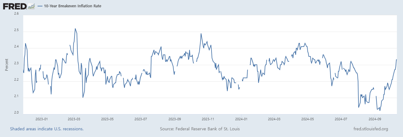 위 그래프는 시계열을 최근 1년으로 확대했습니다. 2024.10.11.까지의 자료를 나타냅니다. 인플레이션 기대치는 '24년 8월 저점이었다가, 9월 추가 하락 후 10월 다시 상승하는 기미가 보입니다.