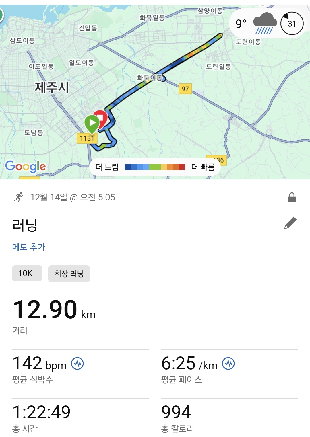 지난주 롱런은 10.5km였다. 이번 주 목표는 12km였지만, 결과적으로 12.9km를 달렸다.